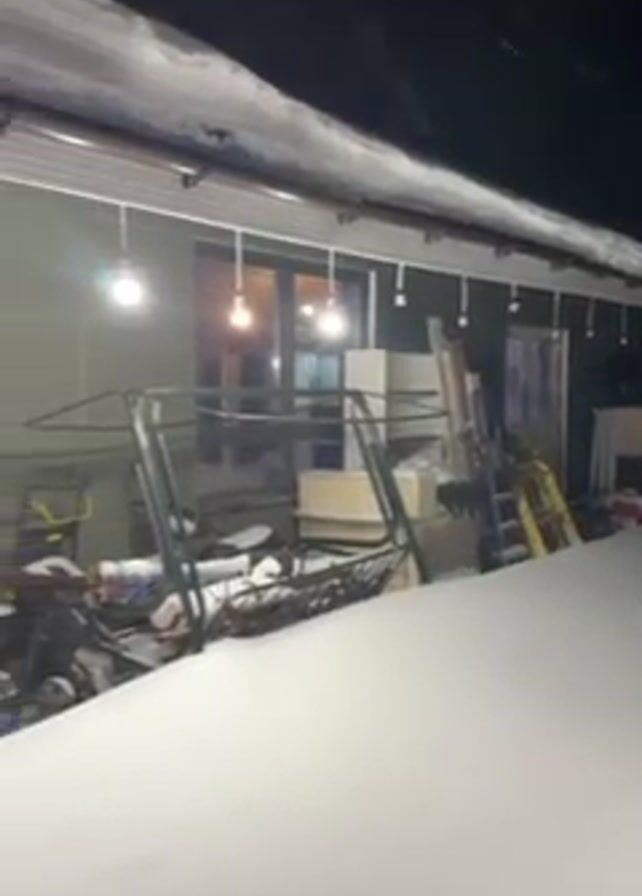 building with a flat roof covered in snow at night. The building has several windows and a door visible. The windows are lit from inside, and there are string lights hanging along the roofline. Outside the building, there is a thick layer of snow covering the ground. There are also various objects piled up against the building, including furniture, ladders, and other equipment. The video appears to be taken from a low angle, with the camera moving slightly. It's snowing, and the sky is dark.