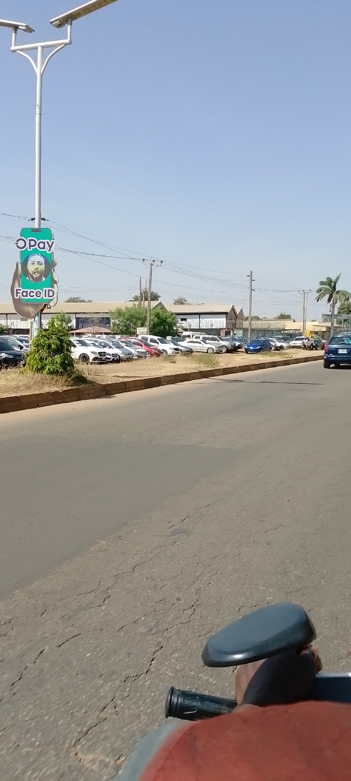 The image captures a daytime street view in Kakuri Gwari, Nigeria, from the perspective of a motorcycle. In the lower right foreground, a partial black handlebar, a dark grey rearview mirror, and a person's arm in a reddish-brown sleeve are visible. The paved road surface exhibits various cracks. A brown curb separates the road from a dirt and sparsely vegetated area on the left. Beyond the curb, a commercial parking lot contains numerous parked cars of various models and colors, including white, silver, red, blue, and black vehicles. A tall white pole stands to the left, featuring a street light at its apex and a green, smartphone-shaped billboard advertising "Opay Face ID" with a graphic of a male face. A small green bush grows at the base of this pole. In the background, multiple one-story buildings with light-colored walls and dark roofs are visible, interspersed with utility poles supporting overhead power lines. A tall palm tree is situated further right in the background. On the road in the distance, a blue car and a dark blue SUV are observed moving away from the viewer. The sky above is clear and light blue.