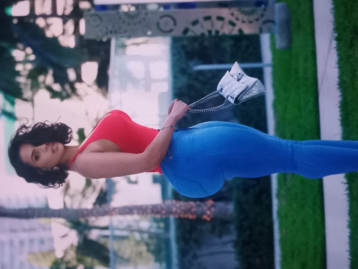 A woman is depicted standing outdoors in the city of Zango-ndaji, Nigeria. She possesses dark, wavy, shoulder-length hair and is looking towards the viewer. She is attired in a red sleeveless top and form-fitting blue pants. A silver-colored handbag with a chain strap is held in her right hand. The background features green grass with a white line, blurred palm trees, and indistinct urban buildings under bright daylight conditions. A decorative metal structure is partially visible in the upper background.