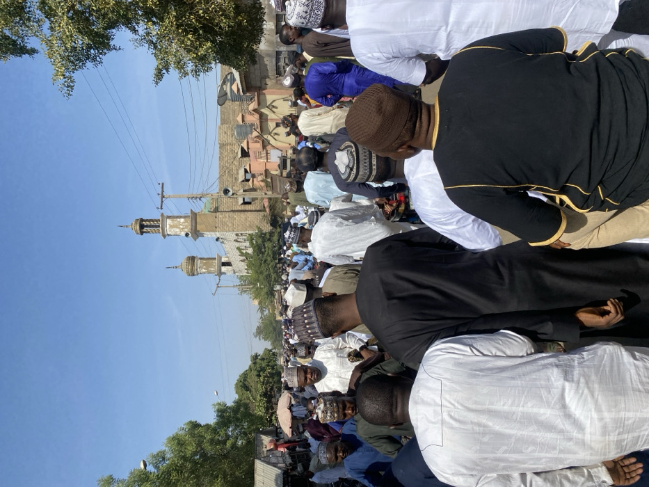 A crowded street scene unfolds under a clear blue sky in Gama, Nigeria. The image captures a large gathering of predominantly adult males filling the thoroughfare, many wearing traditional long robes in white, black, blue, and light brown, along with various styles of prayer caps. The individuals are densely packed, appearing to move or congregate along the street. In the mid-ground, a stone-built mosque is prominent on the right, featuring two distinct minarets with dark, rounded domes atop lighter, cylindrical bases. The mosque building is constructed from light-colored masonry. Adjacent to the mosque are other buildings, including one with a decorative orange-pink facade. Speakers are mounted on poles near the mosque, and power lines traverse the sky overhead. On the left side of the street, less distinct market stalls with corrugated metal roofs are visible. Sparse green foliage from trees lines both sides of the road. Partial views of motorcycles suggest their presence within the crowd. The sun is high, casting minimal shadows directly downwards, indicating midday or early afternoon conditions.