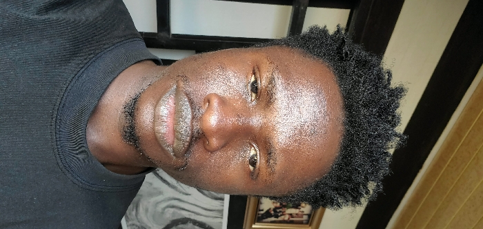 A male individual with dark skin, short curly black hair, a faint mustache, and a small goatee is depicted in a close-up, head-and-shoulders shot