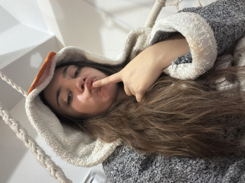 A woman lies down in a hooded, gray and white robe with orange accents. She has long, brown hair. Her finger touches her lips, which are pursed in a pout. The scene is shot from a low angle, looking up at the woman. A thick rope runs diagonally across the frame, suggesting she may be in a hammock or suspended seat. A white wall is visible in the background.