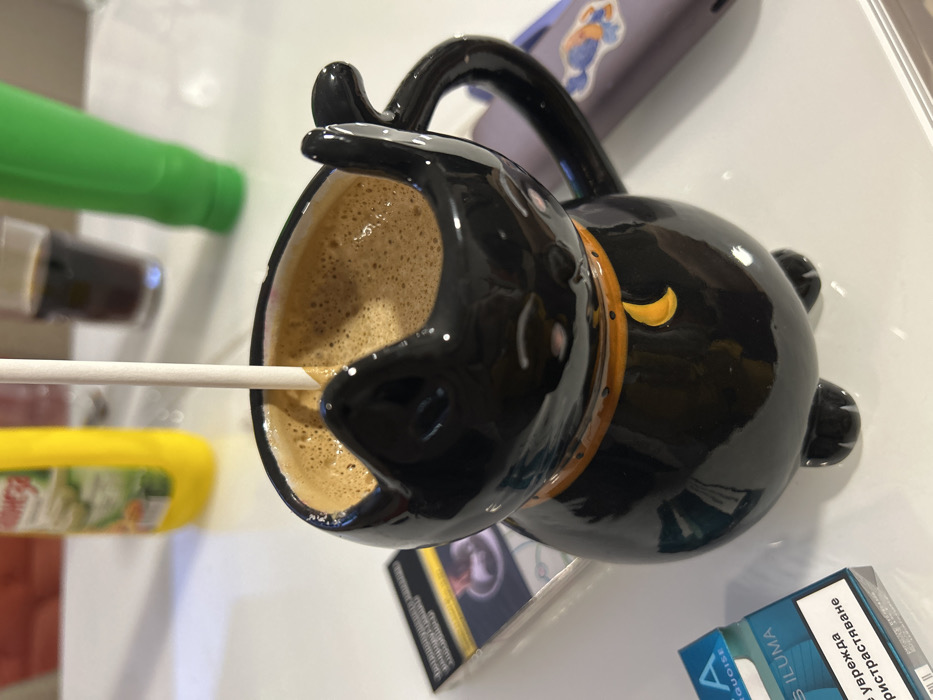The image depicts a static indoor scene on a white, reflective surface, likely a table, within the city of Varna, Bulgaria. Dominating the foreground is a black, glossy ceramic mug shaped like a cat, featuring a handle, molded ears, and an orange collar with a yellow crescent moon design. The mug contains a frothy, light-brown liquid consistent with coffee, into which a white straw is inserted vertically. To the left of the mug, two packs of tobacco products are positioned. The leftmost pack is turquoise-colored, bearing the brand "IQOS ILUMA" and Bulgarian text including "уврежда пристрастяване" (damages addiction). Behind it, a dark-colored cigarette pack displays a prominent Bulgarian health warning label, "ПУШЕНЕТО УБИВА" (SMOKING KILLS). In the background, positioned to the left and out of focus, is a yellow plastic bottle with a green label showing partial Bulgarian text. Further right, a clear glass contains a dark liquid, possibly a beverage like cola. A green elongated object is partially visible to the right of the glass. On the far right, a purple object, possibly a phone case or similar electronic accessory, features a colorful cartoon sticker resembling a wrapped candy or creature. No individuals are visible in the scene.