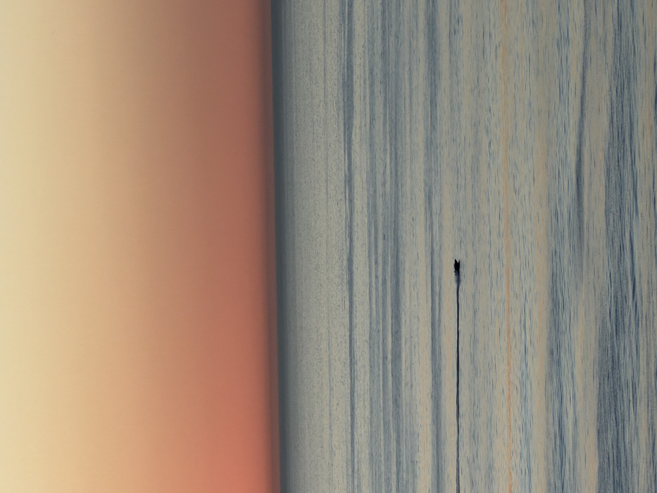 An abstract image features two distinct sections. The left is a gradient of peach and light orange, blurring into a soft, undefined space. The right section has vertical lines in shades of gray, blue, and hints of light orange, resembling wood grain or possibly water reflecting sky. A dark, thin line appears to be a thin object extending upwards, possibly a thin stick or a mast, adding to the overall sense of tranquility and minimalism.