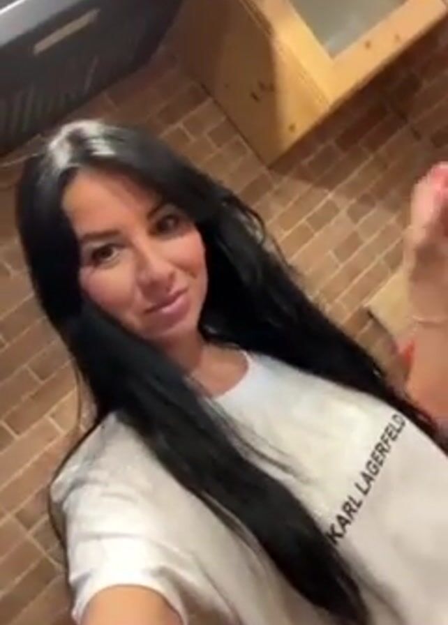 A woman with long, black hair is taking a selfie video in what appears to be a kitchen