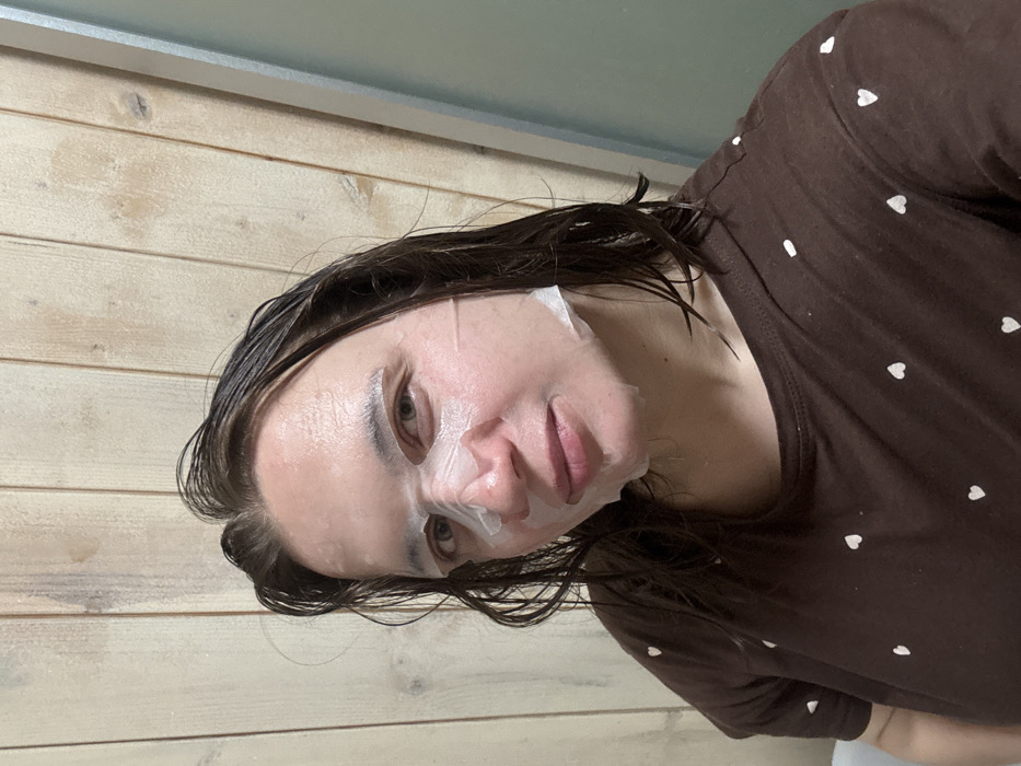 A single individual, an adult female, is depicted indoors in a medium close-up shot. She has wet, dark brown hair and a translucent sheet mask applied to her face, covering her forehead, cheeks, and nose. Her eyes are open, and she is looking directly at the viewer. Her lips are slightly parted. She is wearing a dark brown short-sleeved shirt patterned with small white hearts. The background consists of vertical light-colored wooden paneling with visible grain and some discoloration, possibly moisture stains. A lighter, solid-colored vertical surface is partially visible on the far right. The scene takes place in an indoor setting, location Unknown, Unknown.