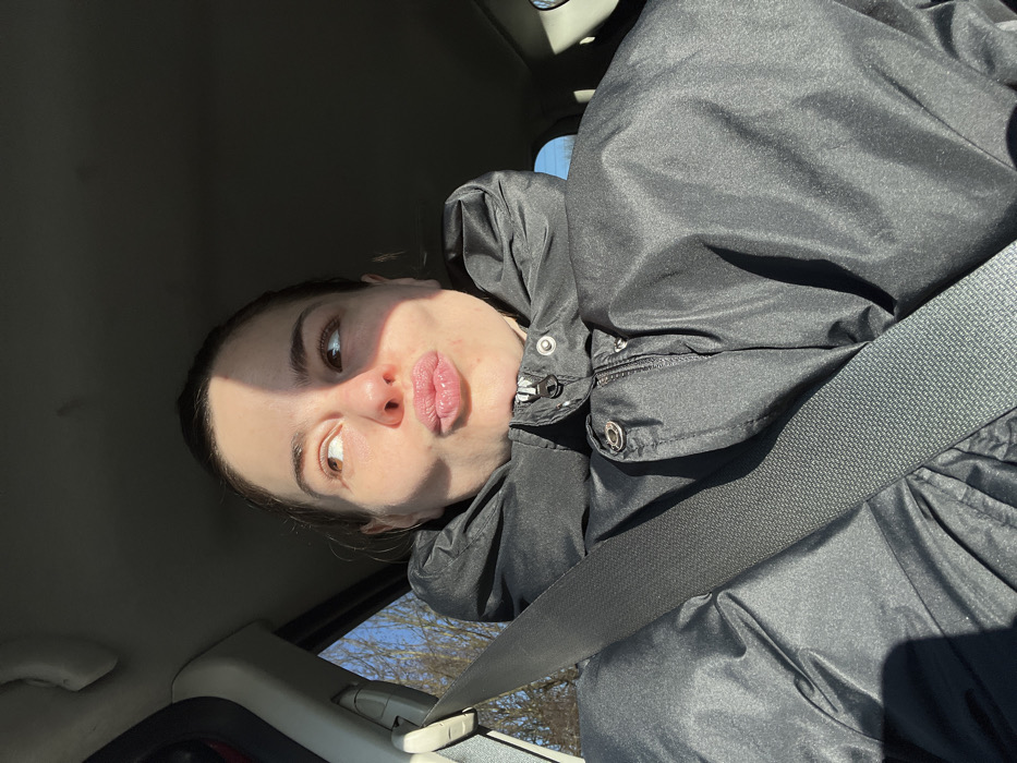 The image depicts an adult female occupant within a vehicle, located in Wasquehal, France. She is centered in a chest-up shot, her head slightly tilted back, with eyes directed upwards and to her right. Her lips are pursed forward in a 'duck face' posture. Direct sunlight from the upper left (viewer's perspective) casts a sharp vertical shadow line across her face, brightly illuminating the left side. She wears a black, high-collared, padded winter jacket, partially zipped, with visible silver-colored snap fasteners on the placket. A black three-point seatbelt crosses her chest diagonally, secured from her left shoulder. The vehicle's interior features a light-colored headliner and a grab handle on the upper left. Through the adjacent vehicle window, a clear blue sky and leafless tree branches are discernible, indicating a sunny outdoor environment.