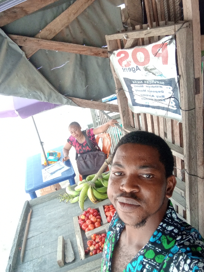 An outdoor market stall in Igrwre-Ovie, Nigeria, is depicted. In the foreground, a young adult male with dark hair and stubble wears an open-collared patterned shirt, looking directly at the camera in a selfie. He is positioned in front of a wooden display surface. On this surface are several bunches of green plantains or bananas and three compartments filled with red peppers or small tomatoes. Behind the male, an adult female with dark hair pulled back, wearing a patterned red and black top and a black shoulder bag, is visible. She leans forward, resting her left arm on a wooden beam, and is seated on an orange plastic chair. Further back, under a purple and white umbrella, a blue plastic table holds a small electronic device, possibly a mobile phone or POS terminal, and some papers. Overhead, a rustic wooden framework supports a grey tarp awning. To the right, a white fabric sign with "POS Agent" printed in red (appearing inverted) is tied to a wooden post, advertising "SERVICES HERE: Withdraw Money, Deposit Money, Buy Airtime." The scene is illuminated by bright daylight.