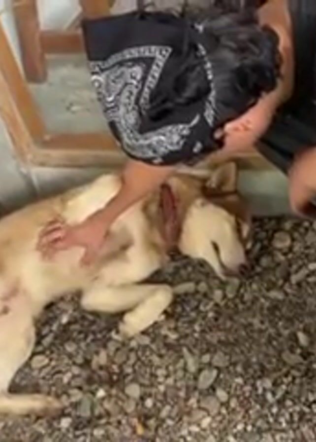 A man in casual clothing and a paisley bandana kneels to pet a light brown and white dog lying on its back on a gravel surface. The dog, wearing a red collar, appears relaxed with its eyes closed. The scene is outdoors, with a weathered wooden chair and a wall visible in the background. The man’s arm and hand tattoos are also noticeable.