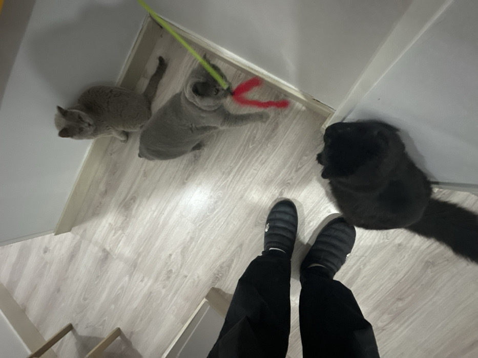 This image depicts an indoor residential scene in Madrid, Spain. The environment features light wood-grain laminate flooring and white walls with light-colored wooden skirting boards. In the left foreground, the lower legs of an individual are visible, clad in black trousers and dark, possibly quilted, slip-on slippers. Three domestic cats are present. In the center-right, a medium-grey cat, consistent with a British Shorthair, is actively engaged with a cat toy. The toy consists of a green rod with bright red feathers or streamers, which is being manipulated, causing the red elements to blur with motion. To the upper right, a lighter taupe-grey cat, also consistent with a British Shorthair, is seated against the wall, observing the scene. In the lower right foreground, a black, long-haired cat is seated on the floor, positioned near the person's feet and facing the right wall. A portion of a light-colored wooden chair leg is visible in the upper left background. The scene is brightly illuminated.