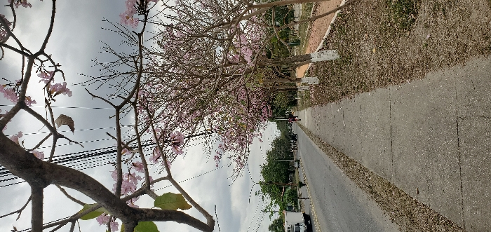 The image displays a street scene in Cabudare, Venezuela, under an overcast sky. A prominent tree branch with pink blossoms and green leaves partially obscures the upper left quadrant. Multiple dark power lines are visible crisscrossing diagonally behind the foreground tree branches. A concrete sidewalk extends from the bottom center into the middle distance on the right, bordered by dry, sparse vegetation and scattered leaves. Parallel to the sidewalk on its left is an asphalt road. On the right side of the sidewalk, a row of trees covered in pink blossoms lines the path, with several tree trunks visibly painted white at their bases. Beyond these trees, a reddish-brown unpaved path is present. On the asphalt road, a white truck is visible on the left side, and a darker vehicle is further down the road. Streetlights and green foliage line the left side of the road. Two individuals are observed walking away from the camera on the sidewalk in the mid-distance. The sky above is uniformly grey with cloud cover.