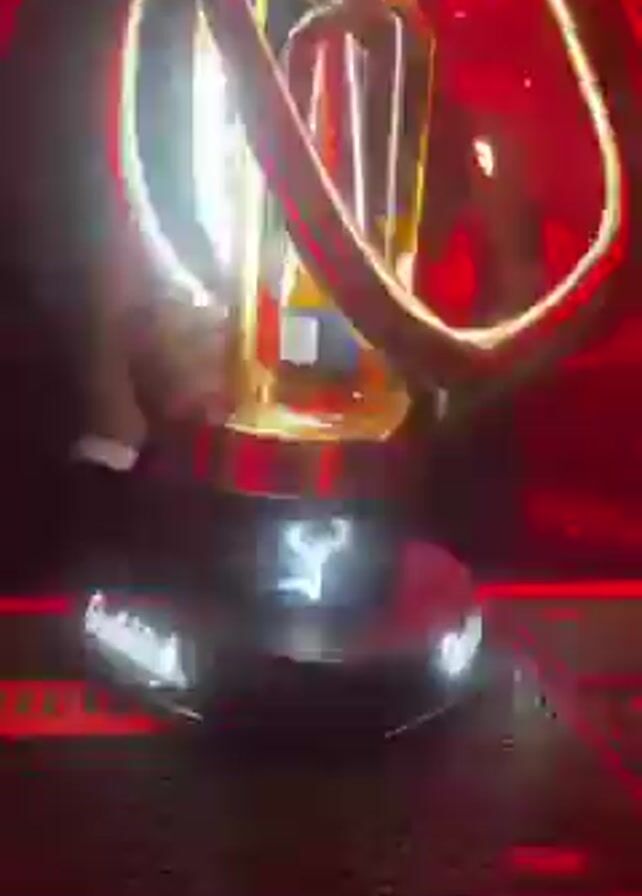 A person lifts a bottle of liquor out of a lit display case. The case has gold-colored arms and a white logo at the base. The environment is dark, with pink and red lights.