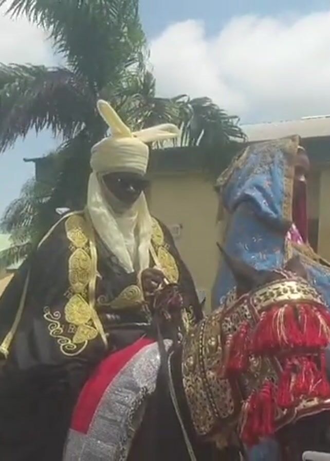 parade or procession of people in traditional West African attire, taking place outside in daylight. Some individuals are on horseback, including one man in a black and gold embroidered robe and a white turban with a distinctive point. Another figure on horseback is adorned in blue and red fabric. The people on horseback are followed by a crowd of people on foot, many wearing head coverings or hats. Some of the people on foot appear to be taking photos or videos with their phones. The background includes buildings, palm trees, and other greenery. A large speaker is being carried by a person in the crowd. The scene suggests a cultural event, possibly related to a royal or religious celebration.