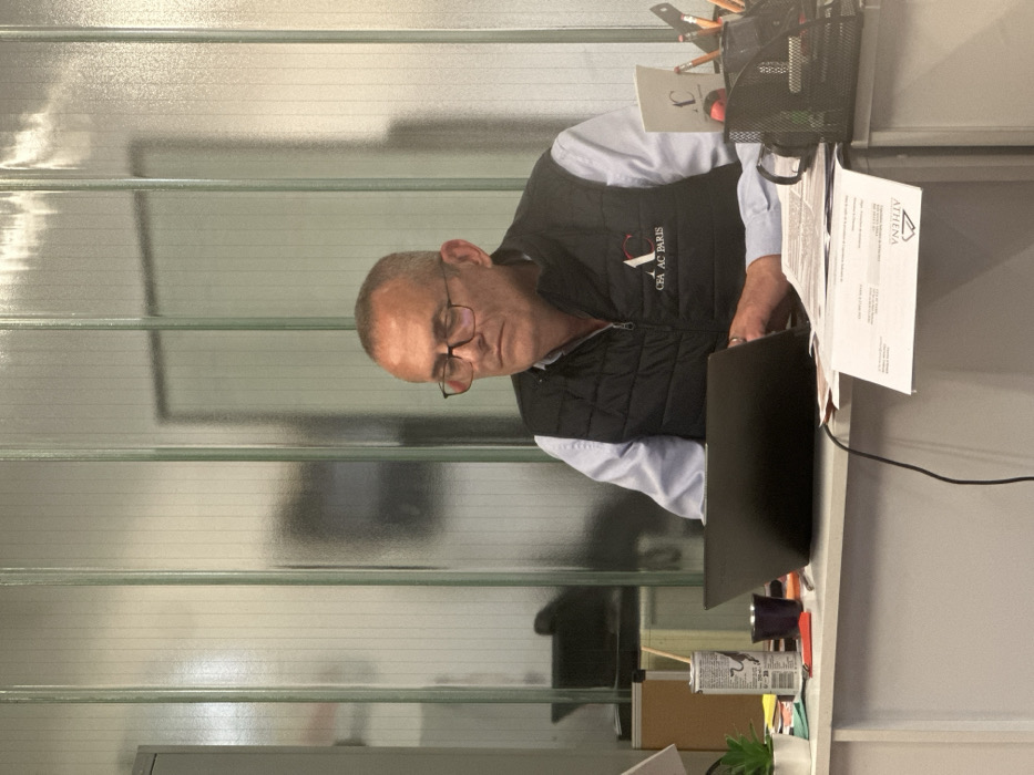 An indoor, eye-level photograph depicts a man seated at an office desk in Aubervilliers, France