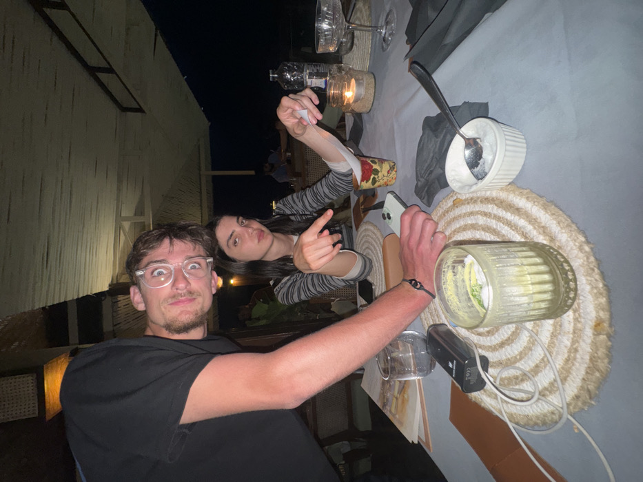 A man and woman pose at a table with drinks and food. The man in the foreground wears glasses and a black shirt. The woman behind him wears a striped shirt and raises one hand. The table is set with glasses, candles, a ramekin with a spoon, and placemats. A phone sits on the table. In the background, a building is visible under a dark sky.