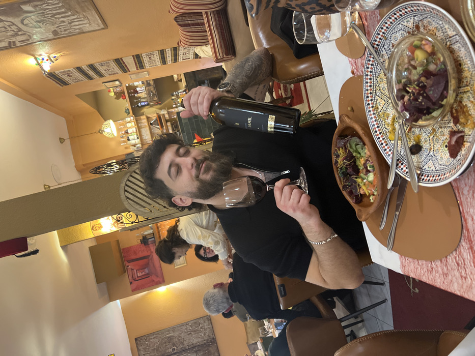 The scene is inside Restaurant Jamil, located at 12 Rue du Bain-aux-Plantes, 67000 Strasbourg, France. A male subject with a dark beard and dark, curly hair, wearing a black collared shirt, is seated at a dining table. He holds a wine glass containing red liquid in his left hand and a dark bottle labeled "JAMIL" in his right hand. A silver chain is visible around his neck, and a silver-colored bracelet is on his left wrist. Tattoos are visible on his right forearm. He is looking towards the left with a slight smile and eyes partially closed. The table features a white tablecloth with a patterned reddish fabric runner and a brown leather-like placemat. In front of the subject, there is a reddish-brown clay bowl containing a salad of dark red (likely beetroot), green, and yellow components, along with a patterned ceramic plate (blue, white, and red design) holding food remnants and a small glass bowl of a similar salad. A fork and knife rest on the placemat, and a water glass is present. The background displays the restaurant's Moroccan-themed decor, including orange-colored walls adorned with patterned fabric hangings, ornate metal wall lanterns, and framed artwork, one depicting an arched corridor. A decorative wooden and metal column structure separates dining areas. Other patrons are visible at adjacent tables, including a male with grey hair wearing a black top and a female (presumably a waitress) in a light-colored blouse interacting with customers. A bar area with shelves of various bottles is visible in the right background. Striped cushions on bench seating are also present. The ceiling is light-colored with overhead lighting fixtures.