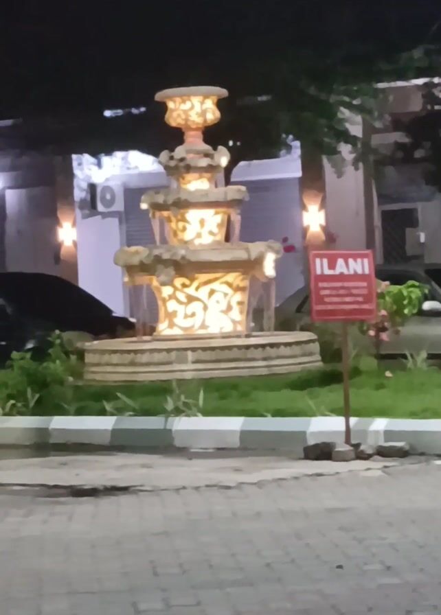 three-tiered fountain at night. The fountain is lit from within, highlighting its decorative carvings. A sign reading "ILANI" is next to the fountain. A car is partially visible to the left, and building façades with lights are in the background. The ground is paved.