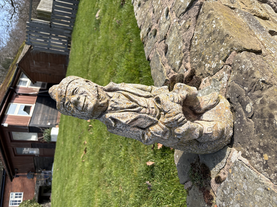 The scene depicts an outdoor garden setting in Annscroft, United Kingdom, illuminated by bright sunlight. In the foreground, a weathered concrete garden statue of an elderly man with a cap, smiling expression, and beard is positioned atop a dry-stone wall. The statue, appearing to be in a seated or crouched posture, holds an indistinct object in its clasped hands and exhibits significant lichen and moss growth, particularly on its upper surfaces. The stone wall is constructed from irregularly shaped, rough-hewn stones, also displaying patches of lichen and moss. Behind the wall and statue, a vibrant green grassy lawn extends into the midground. In the background, a wooden building with dark horizontal cladding on its lower half and reddish-brown siding on its upper half is visible. One white-framed window on the upper left section of this building is partially open. To the right of this structure, a smaller, dark brown wooden shed stands, partially obscured by a light-colored wooden picket fence. Beyond the fence, a tree-covered hillside rises under a clear sky. No human figures are present.