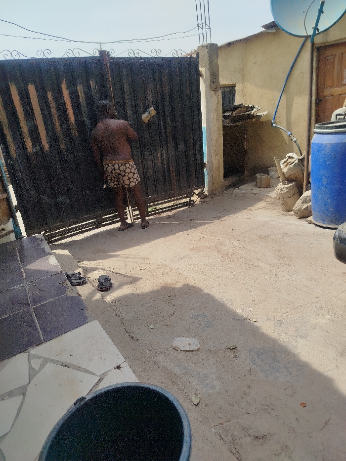 The image displays an outdoor residential or semi-public area in Mape, Nigeria, under bright daylight. A shirtless individual, appearing to be male and wearing patterned boxer shorts and dark sandals, is observed from the rear, facing a dark-colored metal gate. The person is actively engaged in cleaning the gate, holding a light-colored brush or sponge in their right hand against the gate's surface. The gate features vertical slats and decorative scrollwork along its upper edge. To the immediate left of the gate, two pairs of dark sandals or slippers are placed on the light-brown sandy ground. The ground transitions from sandy dirt in the midground to a tiled section in the bottom left, featuring dark square tiles and lighter, irregularly shaped tiles. A black bucket is partially visible in the extreme bottom left of the frame, positioned on the tiled area. Adjacent to the right side of the gate is a concrete pillar, beyond which stands a building with light-colored, possibly beige or tan, walls and a wooden door. A blue satellite dish is mounted high on this building's wall, with a blue pipe extending downwards from its vicinity towards a large blue plastic barrel resting on the ground near the building's foundation. The area around the building's base and on the sandy ground includes scattered rocks and debris. Overhead, multiple thin wires are visible against a clear, bright sky. Shadows are cast on the ground, indicating a high sun angle.