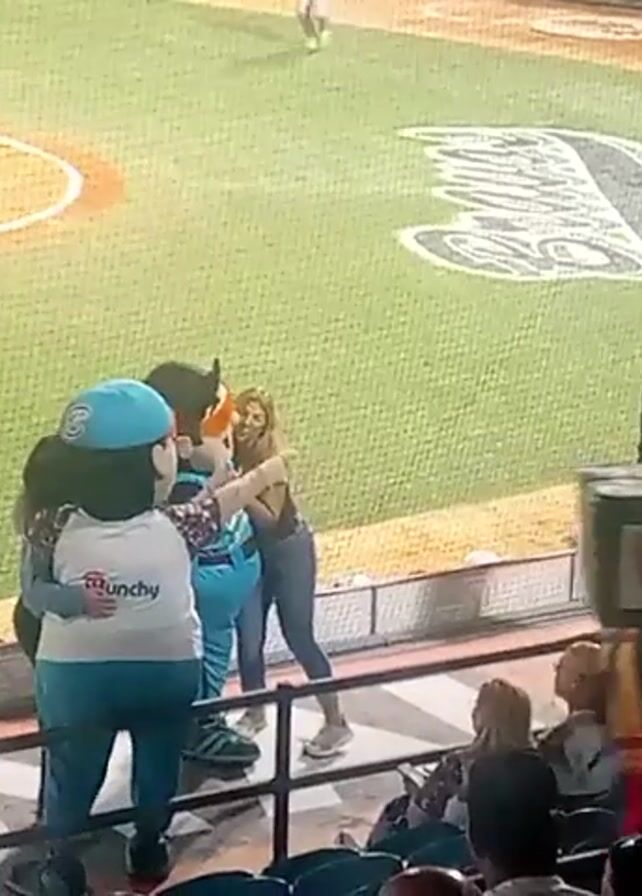 baseball game from the spectator's perspective behind a chain-link fence. Two people in matching turquoise-colored baseball mascot costumes are hugging a woman in jeans and a black shirt. A camera crew with a camera on a tripod is filming them. Behind them is the baseball field. The ground is green, and a baseball player can be seen at bat. There are advertisements on the wall behind the field. The seating area is mostly full.