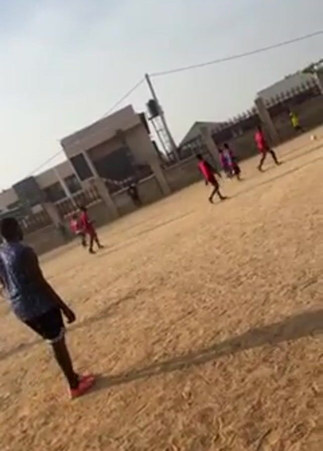 group of people playing soccer on a dirt field. They are wearing red shirts and black shorts. The field is surrounded by buildings and a fence. There is a tall tower in the background. The camera is held by a person who is standing on the edge of the field, and the camera moves slightly throughout the video.