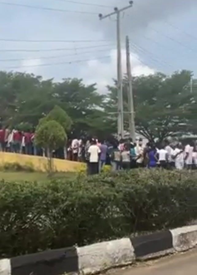The video depicts a crowd of people outside a building, likely a university or college, as suggested by the architecture of the building and the age range of the individuals present. There's a long line of people queued up in front of the building at the start. The camera then pans around the location, showing groups of people standing and walking around on the roads and walkways. There's greenery and trees scattered throughout the area. The sky is partially cloudy. People are dressed in casual clothing.
