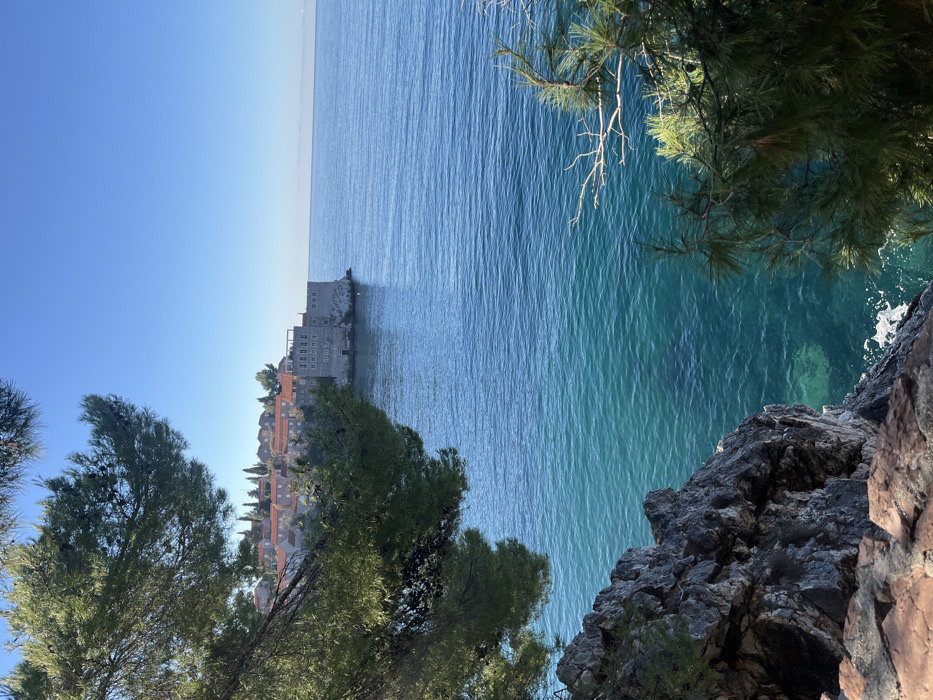 The image presents a panoramic coastal view of Sveti Stefan, Montenegro, under a clear, bright blue sky. The scene is framed by dark green pine tree branches with distinct needles, partially obscuring the top and right foreground. In the lower left, rough, dark gray rock formations are visible, with a small patch of reddish-brown ground at the very bottom. The prominent subject is the island settlement of Sveti Stefan, situated in the midground on the left. It features a cluster of densely packed, light-colored stone buildings with uniform reddish-orange tiled roofs, interspersed with tall, slender evergreen trees. A substantial, multi-story stone building with several windows, appearing as a fortified structure, extends from the main settlement into the clear, blue-green Adriatic Sea. The sea occupies the majority of the lower and central frame, displaying a gradient of color from deep blue on the distant horizon to a clearer, translucent turquoise nearer the rocky coast, with subtle ripples on its surface and minimal white foam visible against the rocks in the bottom right. No human figures or specific activities are depicted.