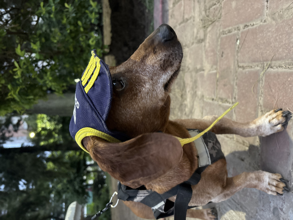 - "A brown dog with a dark nose wears a blue and yellow baseball cap while standing on a brick surface outdoors" by FM-XRROJ2, licensed under CC BY 4.0