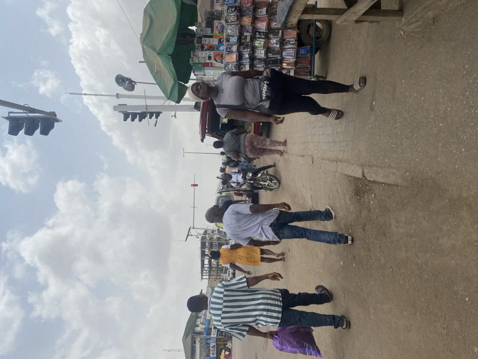 An outdoor scene in Ablekuma, Ghana, depicts a bustling street intersection under an overcast sky