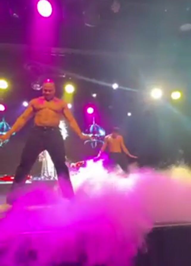 Three shirtless men are dancing on a stage lit with purple and yellow lights