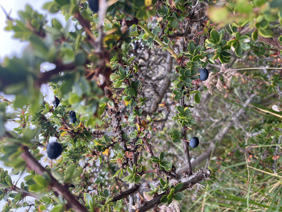 A close-up showcases a woody shrub with small, round, dark blue berries. The leaves are petite, green with lighter edges, densely arranged along thorny branches. Some leaves display yellowish hues. The background is a blurred mix of similar vegetation and grasses. The foreground is slightly out of focus, drawing attention to the central berries and branches.