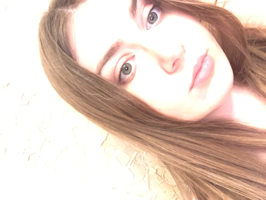 The image displays a close-up indoor portrait of a young adult female, located in the city of Hrodna, Belarus. The subject has long, light brown hair parted slightly off-center, framing her face. Her eyes are light-colored, and she maintains a direct, slightly downward gaze towards the camera. Her facial features, including the nose and closed lips, are visible despite significant overexposure, particularly across the forehead, cheeks, and chin. The background consists of a light-colored, textured wall with an irregular pattern, which is out of focus. No other individuals or discernible objects are present in the frame. The lighting is very bright, causing highlights and reduced detail on the subject's face.