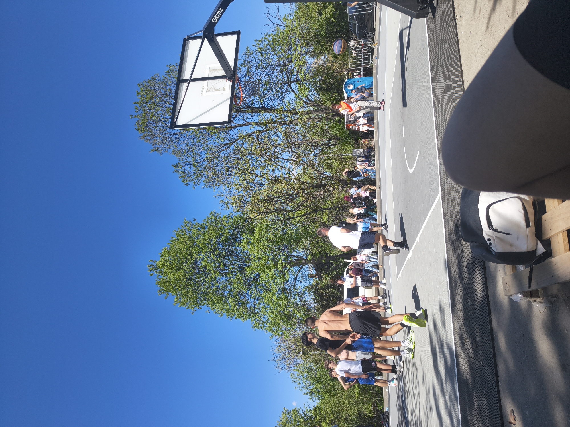 3x3 basketball event in Sofia, Bulgaria. Spectators line the side of a gray basketball court with white lines. Some players are on the court, and a basketball hoop is visible. The sky is blue, and trees are present behind the court and spectators.