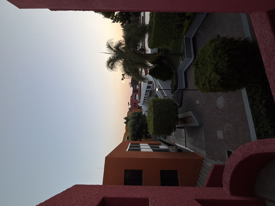 Captured from a high vantage point, the image displays a mix of architectural elements and nature. Buildings with red and orange hues flank a central walkway lined with meticulously trimmed bushes. A palm tree stands tall, silhouetted against a twilight sky tinged with orange and hints of light blue. The paving pattern, street lights, and distant building facades contribute to the composition's depth and visual interest.