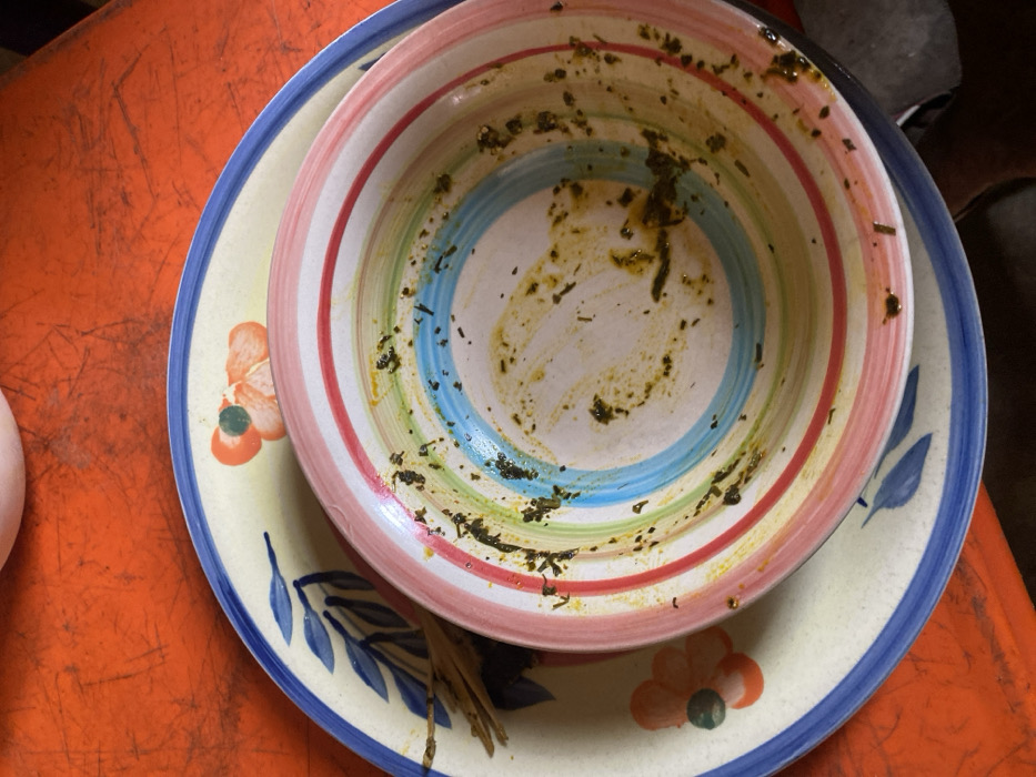 - "A dirty bowl sits atop a floral-patterned plate on an orange surface" by FM-BdfqB3, licensed under CC BY 4.0