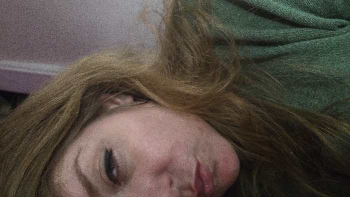 The image presents a close-up, slightly tilted portrait of a female subject, angled from the mid-chest upwards. The subject has long, light brown to blonde hair, which cascades over her shoulders and partially obscures the left side of the frame. She is wearing a green, possibly knitted, garment. The right side of her face is prominent, featuring her right eye with dark eyeliner, her nose, and her mouth, which is formed into a slight pout. Her right ear is visible behind strands of hair. The background is an indistinct, light-colored surface, possibly a wall, exhibiting a faint pinkish or pale purple hue. The image displays noticeable digital grain or noise. The specific location within the city of Lompoc, United States, cannot be determined from the visual information present, which depicts an indoor setting.