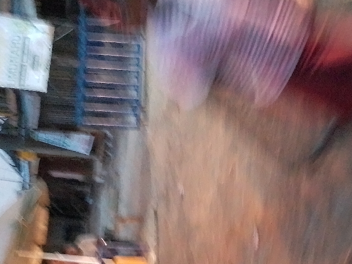 A blurry, tilted shot presents a street scene. A sign with "IMUTARU" visible stands next to a blue metal rack. Faint shapes suggest shelves or goods displayed. An indeterminate figure or mass, with shades of purple and red, dominates the right side. The lower part of the frame is a textured blur, possibly the ground or a busy pedestrian area. The overall image has a distressed, hurried quality due to the poor focus.
