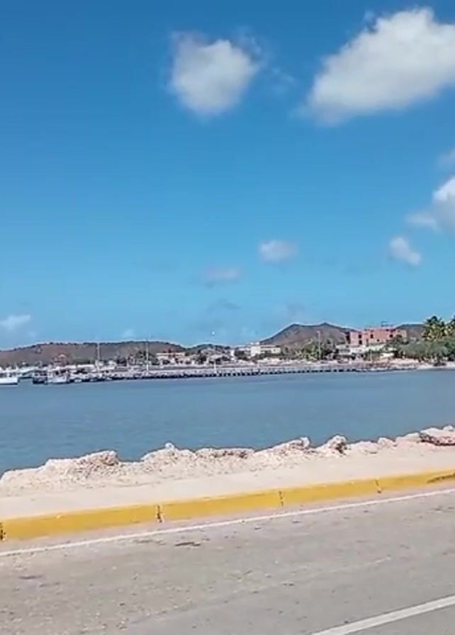 The video captures a scenic coastal view on a bright, sunny day with a clear blue sky dotted with a few white clouds. The foreground is a road with a yellow curb, beyond which lies a textured, rocky barrier leading down to the sea. The body of water is calm, with several boats anchored at various distances. Across the water, a land mass rises into a hill on the left, appearing to have some structures on it. A long pier extends into the water from the shore, where there are buildings and trees visible. The landscape suggests a tropical or subtropical environment. The camera appears to be stationary, offering a static shot of the scene. There are sounds of traffic audible, including a car passing by.