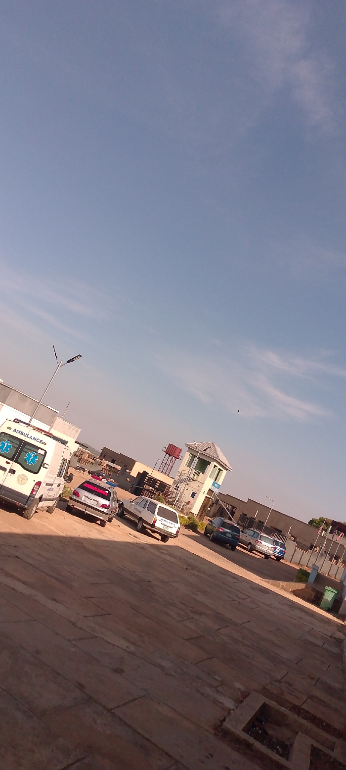 A slightly tilted shot reveals a collection of vehicles, including ambulances, parked on a brick surface. A building with a lookout tower stands prominently in the background, flanked by other structures. The sky is a pale blue, with hints of clouds. The scene is brightly lit, casting shadows that emphasize the brick pattern on the ground. A lone street light and trash receptacle are visible.