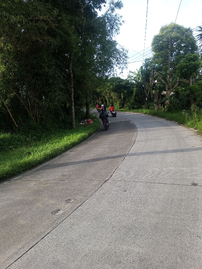 A winding concrete road curves through lush greenery. Three people on motorbikes are traveling up the road. The first biker is closer to the viewer. Trees line either side of the road, creating a canopy. Telephone wires are visible overhead. A small pile of what looks like trash sits on the left side of the road next to the greenery. Patches of uneven pavement are visible.