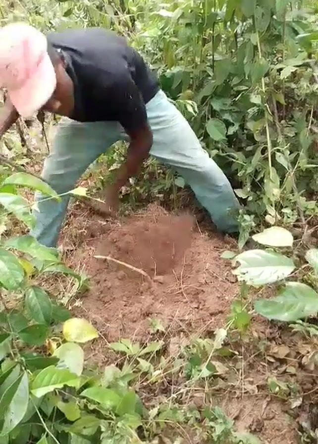 A person wearing a dark shirt, light blue pants, and a pink hat is digging in the dirt with their hands. The person is bent over, working on a patch of brown soil that is surrounded by green plants and grass. The person appears to be in a natural outdoor setting, possibly a garden or a field. They are using their hands to loosen and move the soil.