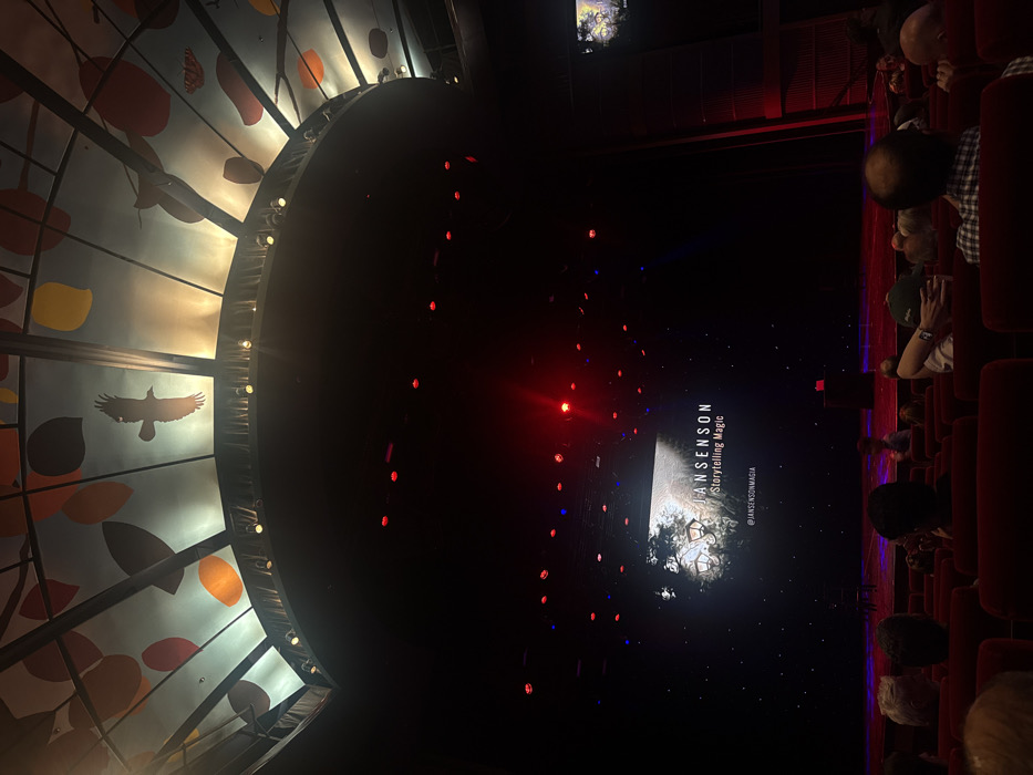 An indoor theatre view shows rows of seated patrons to the right. A central stage displays the words "JansenSon Storytelling Magic" above an image of intertwined trees. Overhead, a dome-shaped structure radiates light from numerous small bulbs and has flat decorations depicting leaves and birds. The scene appears dimly lit, with red accent lights around the stage area.