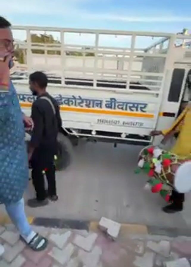 A short video shows a group of men walking alongside a parked white truck with yellow writing on the side. The men are carrying and playing dhol drums, which are decorated with colorful tassels. One man is on a phone call as he walks. The scene is set outdoors, with a sidewalk and street visible. The sky is visible above.
