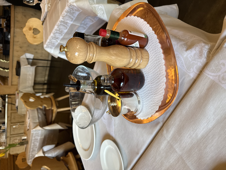 The image displays the interior of a dining establishment, a restaurant, located in Sankt Moritz, Switzerland. The perspective is from a table set for dining. In the foreground, a white tablecloth covers a table. Centrally placed on this table is an oval, hammered copper-colored tray resting on a white scalloped paper doily. The tray holds a large, light-colored wooden pepper mill; a silver-colored lidded condiment container with a small yellow spoon; a glass bottle of dark liquid with a black pour spout, likely olive oil; a smaller, round glass bottle containing dark liquid, likely balsamic vinegar; and a small glass bottle with a red cap and white label, identifiable as Tabasco sauce. To the left of the tray, on the tablecloth, are two white ceramic plates, partially stacked, and a clear glass salad bowl containing metal tongs. The midground reveals multiple unoccupied dining tables, each draped with white tablecloths. Accompanying these tables are wooden chairs, distinguished by a heart-shaped cutout in their backrests. Wooden wall paneling and structural elements are visible throughout the space. The background shows additional tables and chairs, along with elements suggesting a service or bar area, including shelves. No individuals are present within the frame. The lighting suggests an indoor environment.