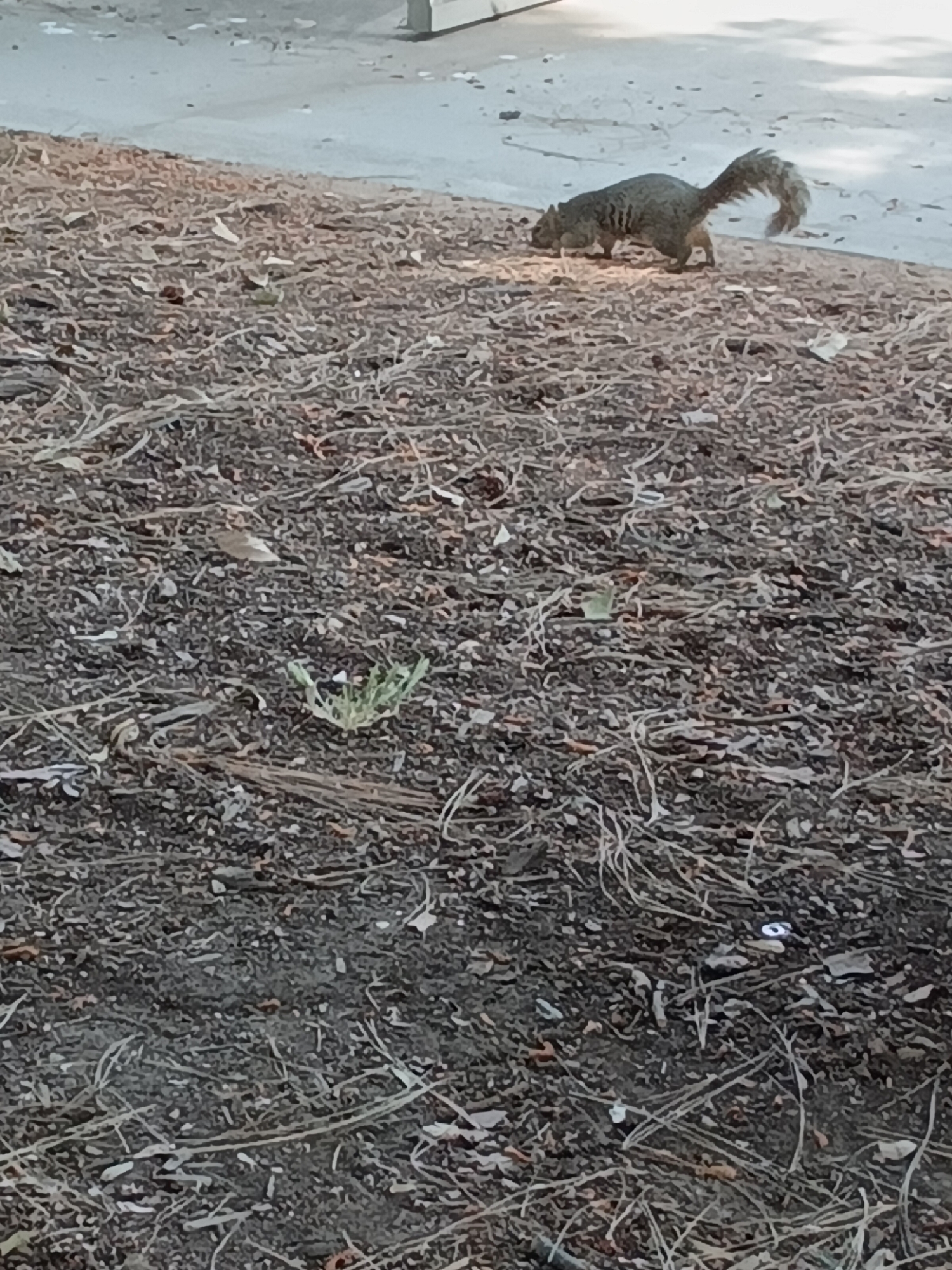 The scene depicts an outdoor environment in East Los Angeles, United States. A single gray squirrel is the primary subject, positioned in the upper center-right portion of the frame. The squirrel is oriented right, with its head lowered towards the ground, appearing to forage or sniff. Its bushy tail is curved upwards and backwards. The ground in the foreground and mid-ground is covered densely with dry organic matter, including small twigs, desiccated leaves, and detritus, creating a textured brown and dark gray surface. A small cluster of green vegetation is visible towards the lower-mid left of the frame. In the background, a light gray or off-white paved surface, possibly asphalt or concrete, is visible, suggesting a pathway or road. A faint, diffuse shadow falls across this paved surface from the upper left. No human individuals or artificial structures other than the paved surface are clearly identifiable. Natural lighting suggests daytime conditions.