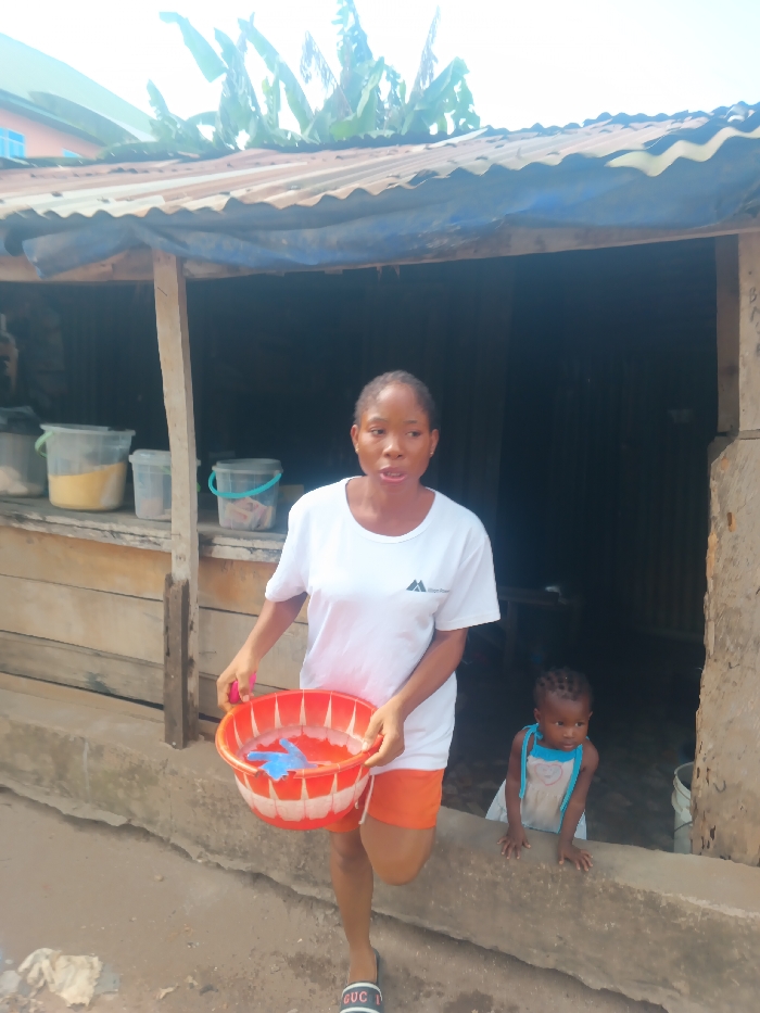 A woman in a white t-shirt and orange shorts carries a red and white basin filled with water and a blue object. She stands outside a weathered structure with a corrugated metal roof and wooden supports. Various containers sit on a shelf inside. A young child in a white dress with blue straps stands behind her. The ground appears uneven, and the lighting suggests an outdoor setting.