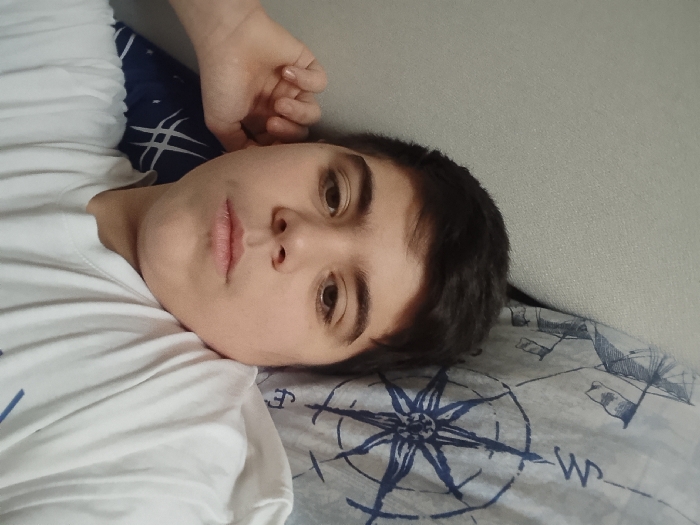 A person lies on their side against a pillow adorned with a compass design. They wear a white t-shirt and appear relaxed. Their head rests on the pillow, their brown hair is visible near their face. Their eyes are open, and their expression is neutral, the background is plain and neutral.