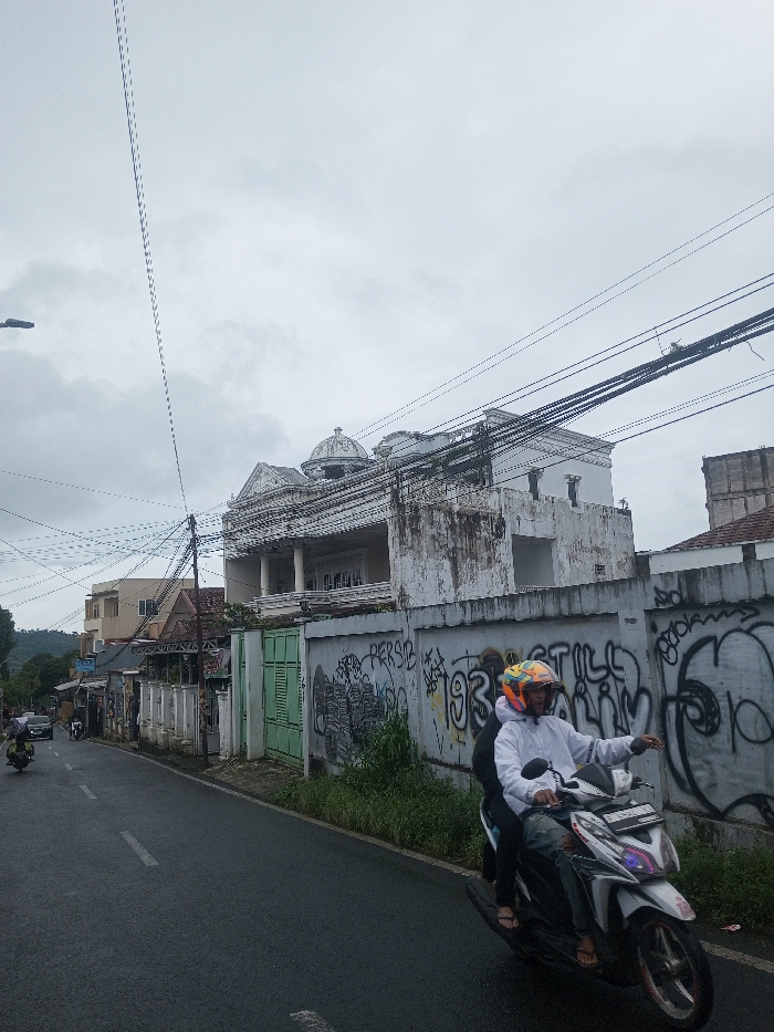 A street scene under an overcast sky features a scooter with two riders in the foreground. The road is wet and gray. To the right, a wall covered in graffiti runs along the roadside, fronting a dilapidated white building with ornate architectural details. Further down the road are other buildings and structures. Overhead, a tangle of power lines crisscrosses the sky.