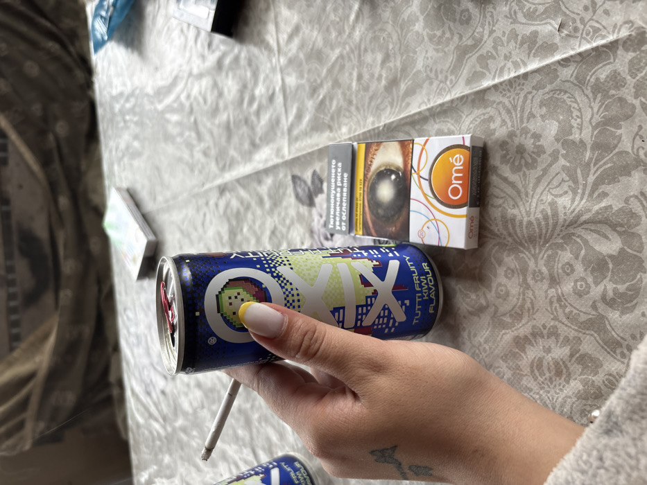 An indoor scene in Kastel, Bulgaria, presents a close-up view of a human hand holding a beverage can with a cigarette, positioned on a patterned tablecloth