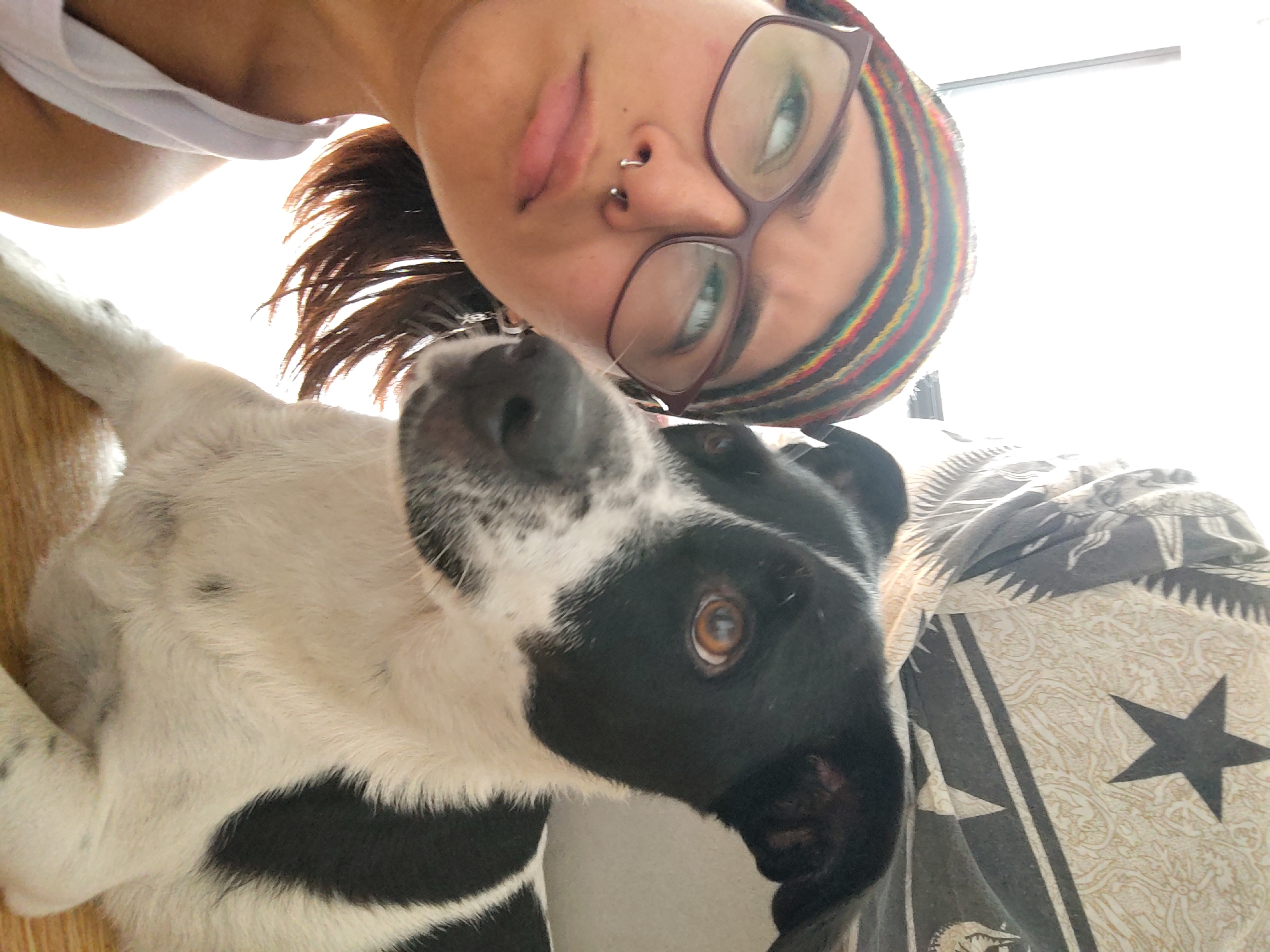 A woman with glasses and multiple nose piercings is taking a selfie with a white and black dog